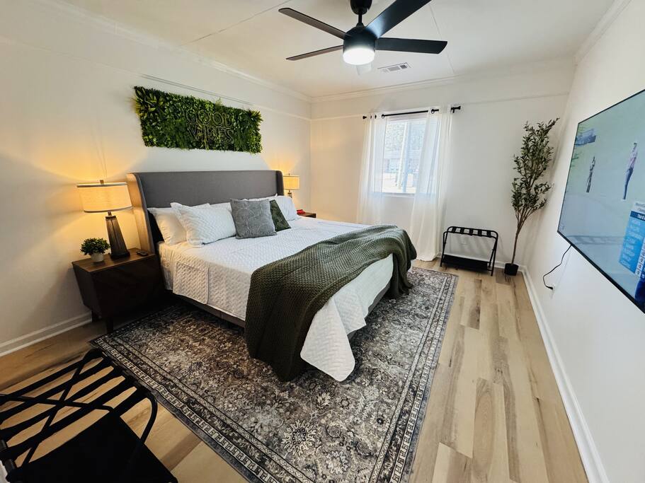 Bedroom 1: King w/ 65" TV Bedroom 2: Queen Bedroom 3: 2 twin xls *There is also a queen air mattress and pack n' play 1 bathroom with shower/bathtub combo